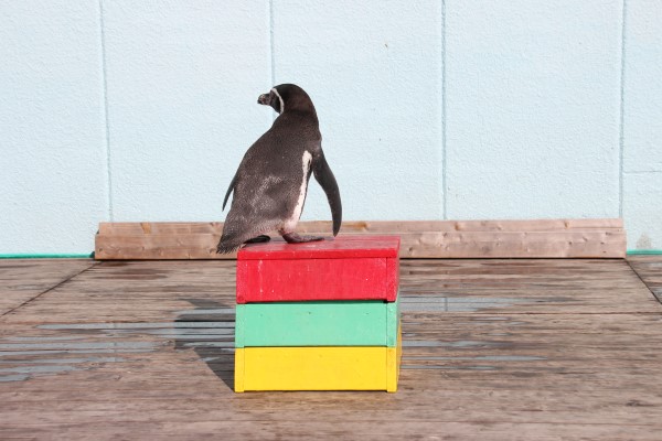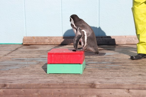 こちらは同僚フンボルトです。3段もクリア。台の高さは背丈ほどもあります。ペンギンのジャンプ力、すごいです。