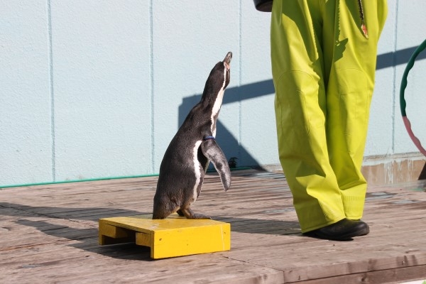南知多ビーチランドのペンギンパフォーマンス、種目はペンギンジャンプ。フンボルト、ちゃんと指示通りに台にあがります。