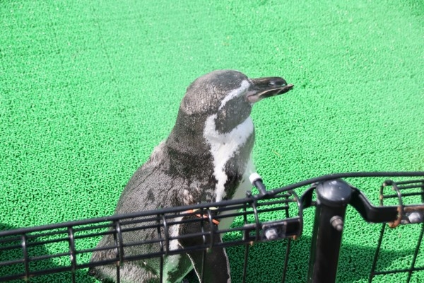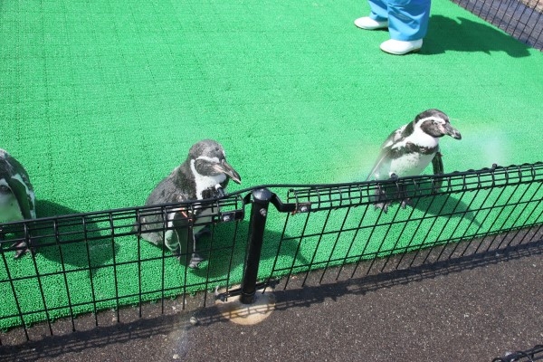 越前松島水族館のフンボルト散歩会場です。フンボルトは日本の気候で平気な温帯ペンギンですが、やっぱり人が暑い時はペンギンも暑い。そこで、会場のフェンスにはミスト設備が完備。こちらは至近距離でミストを浴びるフンボルト。涼しいのがわかっているんですね。