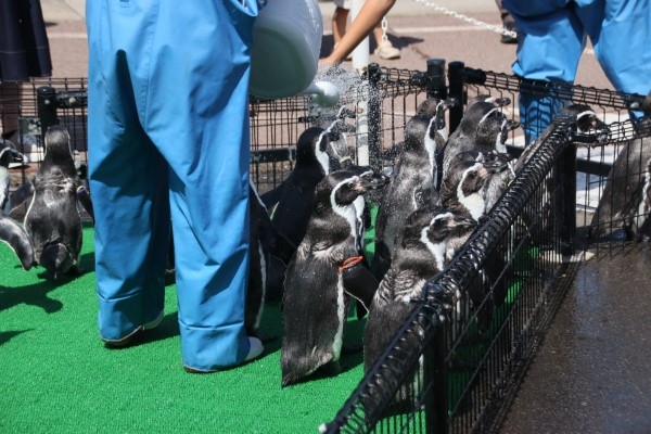 前回はミストで涼んでいた越前松島水族館のフンボルト、引き上げるときは全員そろってシャワーです。ゲート前に集合して、大きな如雨露で水をかけてもらいます。もしかしたら彼ら、自分ちにいるときには味わえないミストやシャワーがお目当てで自発的にお散歩に出てくるんじゃないでしょうか。