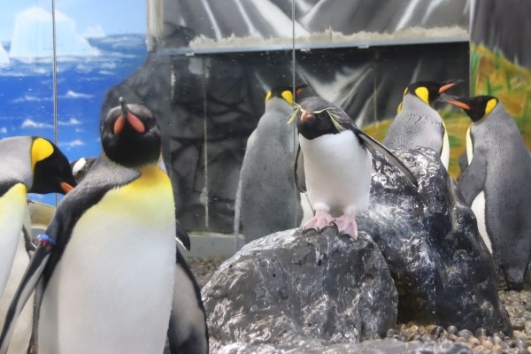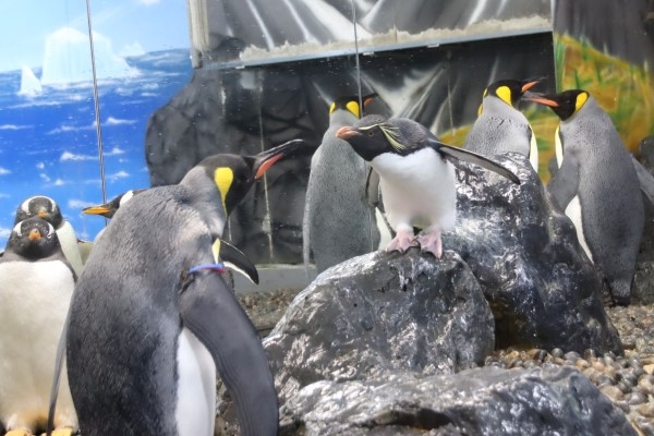 「やんのかコラ!」 「ゆるさんで!」 キングとイワトビの激しい?にらみ合い。越前松島水族館のぺんぎん館です。休憩スポットとして人気の岩組みをめぐって、まさにツツキ合いでも始まりそうな雰囲気ですが。