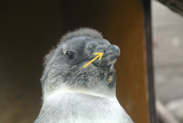 前回と同一のかわいい御子様ケープです。ところで、ペンギンの鼻ってどこにあるのでしょう。写真の矢印のところに小さな黒い穴が開いています。これがペンギンの鼻の穴。なので、鼻はクチバシにあるということに。(2025/07/01)