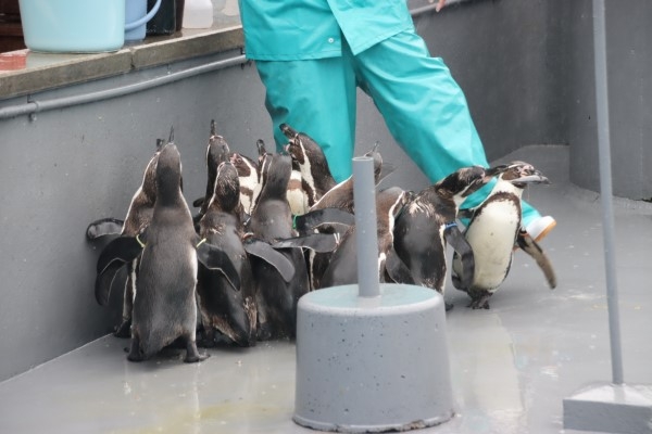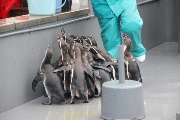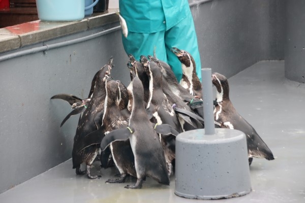 南知多ビーチランド、子育てフンボルトのプールでお食事タイムが始まりました。みんなのクチバシが、しっかり同じ方を向いています。