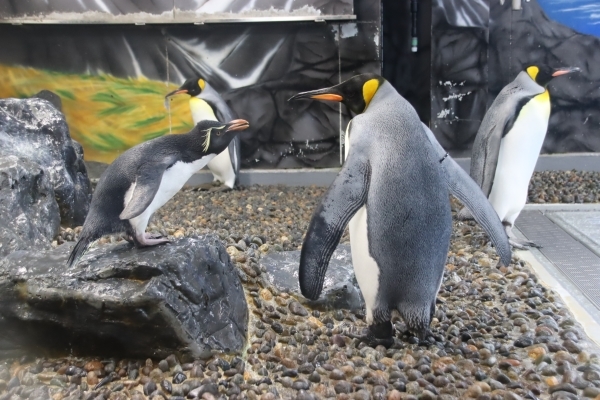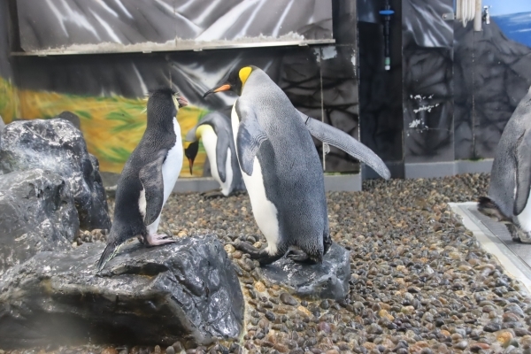 なにかにらみ合いの様相に。じつは、この石組みの高台は、3種いるペンギンたちに人気の場所なんです。