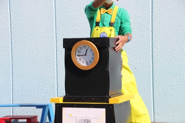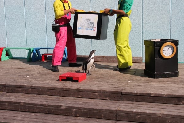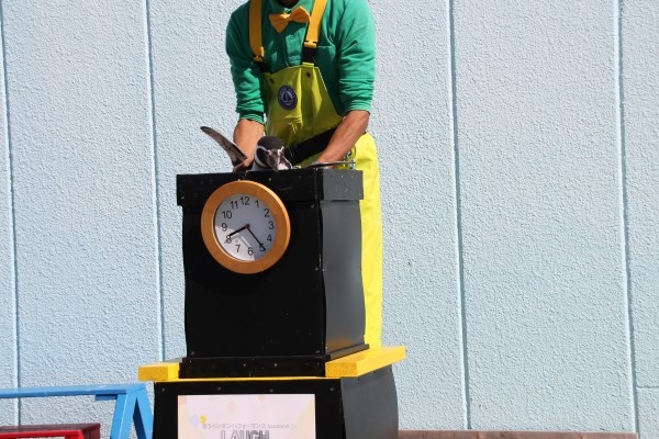 こちらは南知多ビーチランド、期間限定で行われるペンギンパフォーマンスの会場です。時計のついた箱に収められるフンボルト。もちろん、パフォーマンスの熟練ペンギンです。