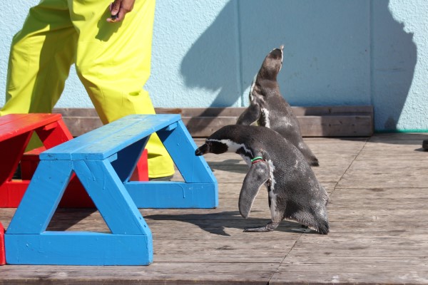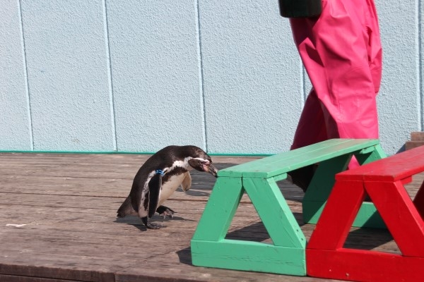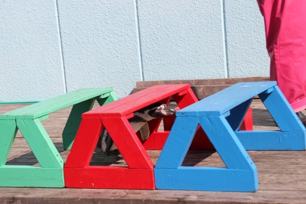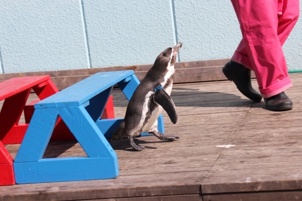 南知多ビーチランドの期間限定イベント、ペンギンパフォーマンス。次は連続台くぐり。フンボルト青青、しっかりとコースを見定めてスタート!