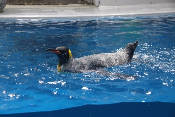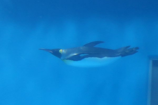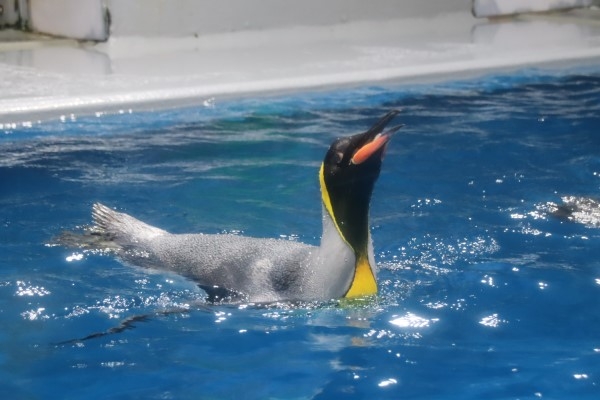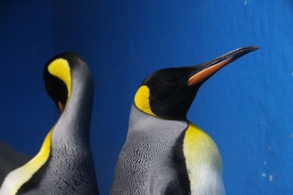 ペリカンの首を観察したあとは、ペンギンです。南知多ビーチランドのキング、手前が通常の立ち姿、奧が伸ばした首の形。外からは見えませんが、手前の個体ではこの長さの首がS字形に曲がっておさまっているわけです。
