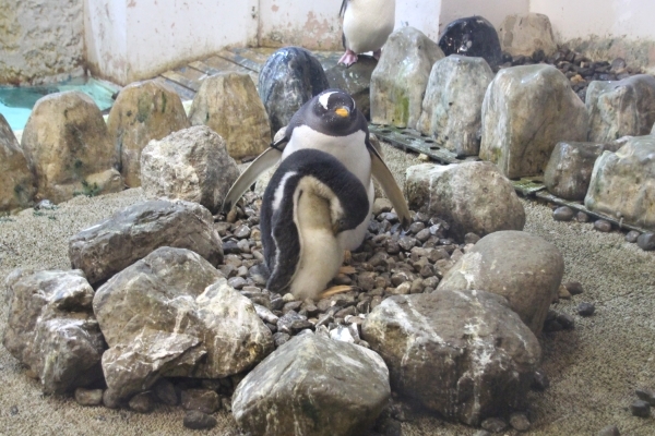アドベンチャーワールドでこうした子育て風景を見るなら、冬休みとその前後頃が高確率。冬季には照明が南極の夏(すなわち繁殖期)を模しているからです。この写真は12月中旬に撮ったものです。