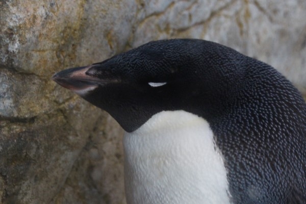 目を閉じると、白いアイリングが上下くっついて、一本の線みたいになります。あるいは、半開きの白目みたい?ですかね。モデルはアドベンチャーワールドのアデリー。