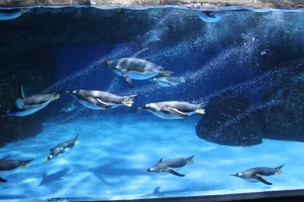 八景島シーパラダイスのキングとジェンツーが、泡をなびかせ影をお供に、優雅に泳いでいました。