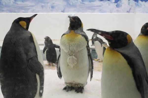 房飾りが付いたファーの毛皮ケープをまとう王様?みたいなキング。キングだから王様にきまっている、というツッコミはさておき。換羽中には、このような楽しい残り羽模様が見られることも。換羽が終わると、ピカピカスリムなお姿で婚活が始まります。アドベンチャーワールドにて。