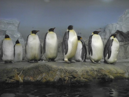 アドベンチャーワールドでずらり並んだペンギンの大きな皆さん。キング(王様)とエンペラー(皇帝)、見分けてみましょう。