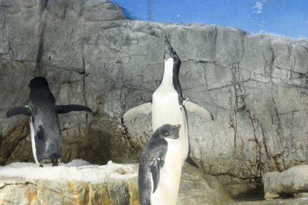 海遊館のアデリー、首を伸ばして高らかに歌っています。アゴの下の白黒境界線がハート形(の上半分)になるんですが、正面から撮れなくて残念。伸ばす前の首は一緒に写りました。身体は小さいけれど、アデリーの首もけっこう伸びます。