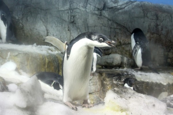 こちらは海遊館のアデリー亜成鳥。ノビをして目をむいているので白目が出ています。そのうえ顔が上下白黒に色別れしていて、このポーズだとウナギに似ているような?