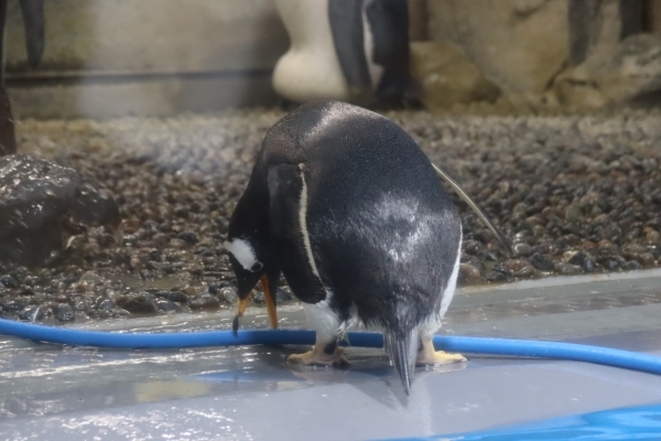 越前松島水族館のジェンツー、お掃除のホースが気になって・・・。どこのジェンツーでも、ホースは気になるようです。