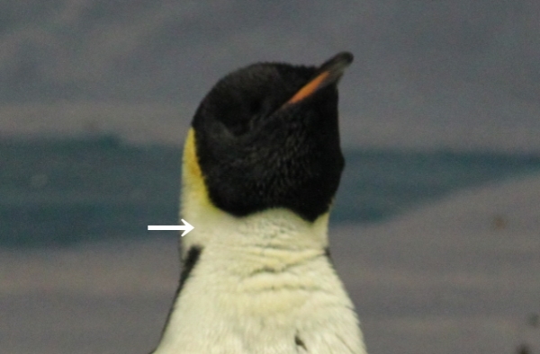 名古屋港水族館のエンペラー、ノビをしたあと首をブルッとふるわせたところです。で、頭部両側の模様にご注目を。