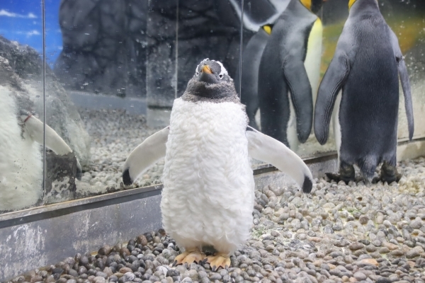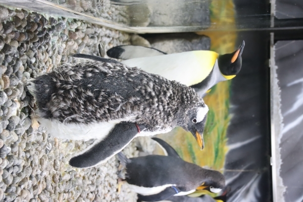 越前松島水族館のジェンツー、お着替え中の図。ペンギンは1年に1回、全身の羽が抜け替わります。ちょうど換毛期の柴犬みたいに、旧羽が浮き上がってもふもふになります。ジェンツーの場合、このようにフリッパーだけ先に換羽完了することが多いです。