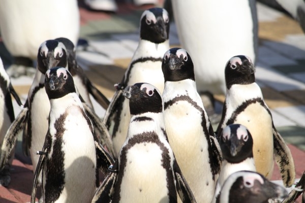 「急げ!走るな!」「あせったらあかんで!」 迫り来る謎の白いハラに追われているようなケープ集団。アドベンチャーワールド、ペンギンパレードの帰り道です。急ぎ足のケープと、ゆったり気ままに進むキングでした。