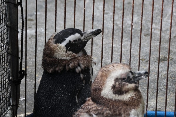 上越のマゼラン、換羽中の図。手前は換羽が始まってまもないので、旧羽がもりあがってきて全身がもふもふです。柴犬の換毛と似ていると思います。奧はほぼ換羽終了。首の回りに旧羽が残るのみになっています。