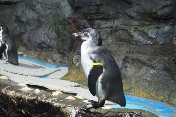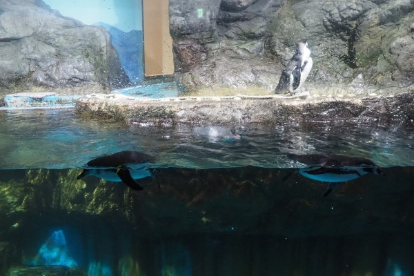 浅虫水族館のフンボルトです。水中の2羽、よく見ると身体の模様が違います。毎度おなじみ、亜成鳥見分け写真でございます。左が亜成鳥、ついこの間までほわほわのヒナだったのが、大人と同じように泳いでいます。