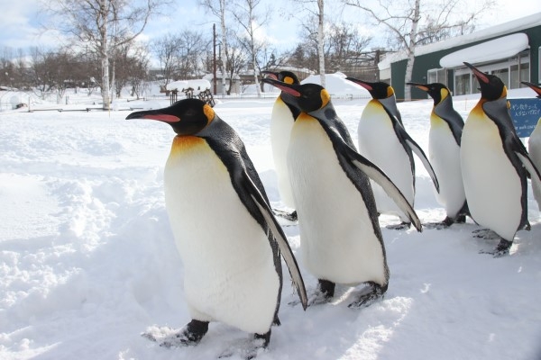 涼しい風景をお届けします。旭山動物園のペンギン散歩、キング集団が楽しげに歩いています。