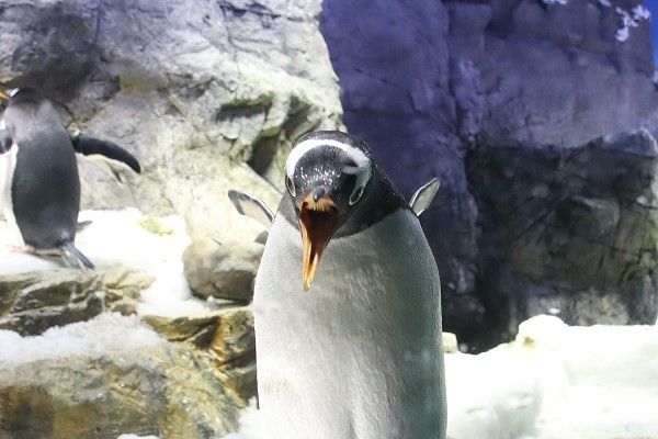 なんかコワイ。歯をむき出している? 黄色いチョビ髭が生えている?前回と同じ海遊館のジェンツーがノビを始めたところです。上クチバシの中に見えるのは、口の中の突起です。舌にもありますが、口の奥に向かってびっしりと突起が並び、サカナを頭から丸呑みにしやすいようになっています。