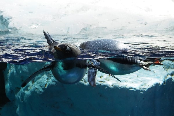 仲良く泳ぐ海遊館ジェンツー。完全防水の羽毛、白いハラがメタリックに輝いて美しい。