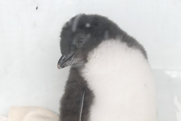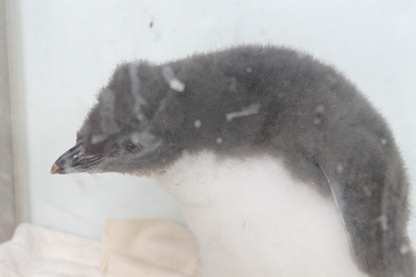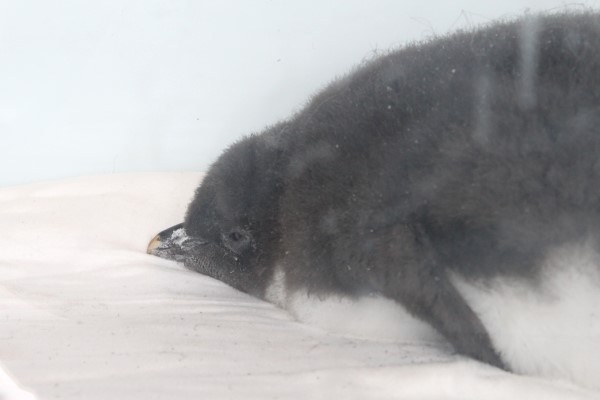 アドベンチャーワールドで見たほわほわのイワトビヒナ、おやすみ中。人工育雛されているヒナです。