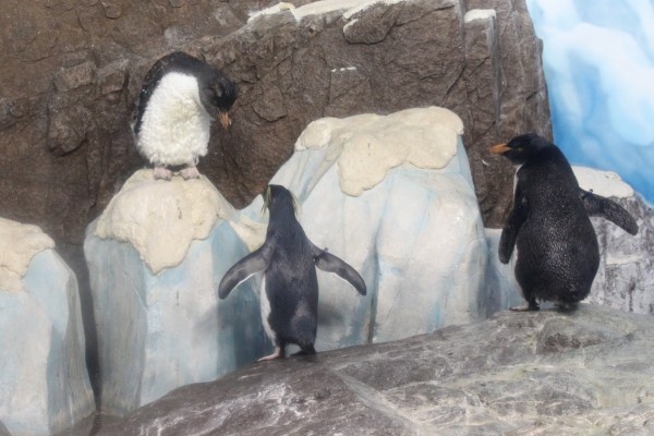 アドベンチャーワールドのイワトビ、ご覧の3羽の冠羽にご注目を。右は亜成鳥、『眉』がまったくありません。高いところにのっかっている換羽中の個体は、『眉』の黄色い羽が見えているので、一年先輩なのでしょうか? 換羽が終われば冠羽がもっとはっきりするでしょう。真ん中は、頭がつんつんなのは遠くてよく見えませんが、長い『カンザシ』状の冠羽がしっかりあるので成鳥です。頭がつんつんしているのもいないのも、どれもイワトビです。