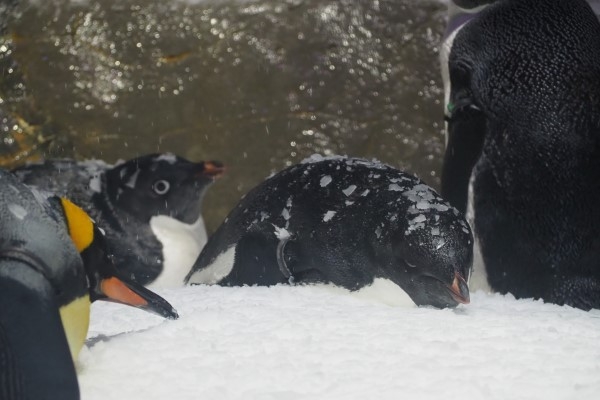 前回までのパリピな仲間とは異なり、静かに過ごすペンギンたち。雪の冷たさをしみじみと味わっています。人工雪の落ちてくるポイントに寝ころぶキングとアデリー@海遊館。