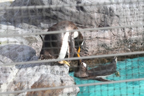 水中と陸上とで仲良くごあいさつ、登別マリンパークニクスのジェンツー。