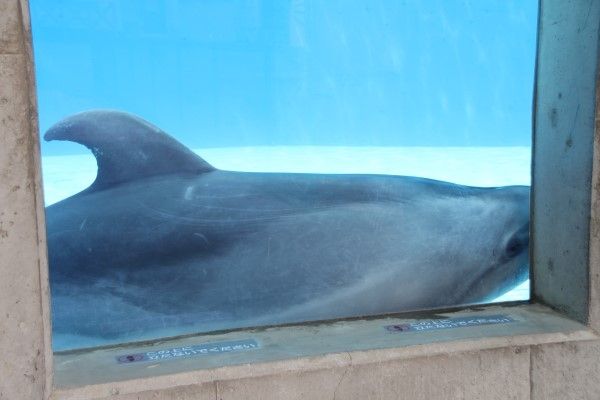 「べつに見てなんかないですけど?」 お顔を隠して目だけ出して?見てない素振りでしっかりと外の人間を観察している女子イルカ、越前松島水族館でした。
