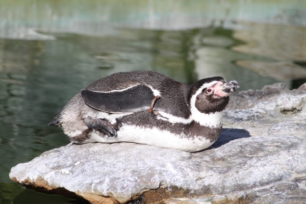 プール中央の島で日向ぼっこするフンボルト。足を引っ込めているあたりがもっちりした感じで、たまりません。