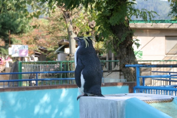 プール中央には水の流れるすべり台のようなスロープがありましたが、ペンギンが滑ることはなく、ペタペタと歩いて降りていました。古いけど、緑に囲まれた、ちょっと素敵な場所でした。