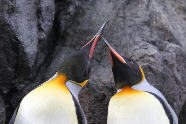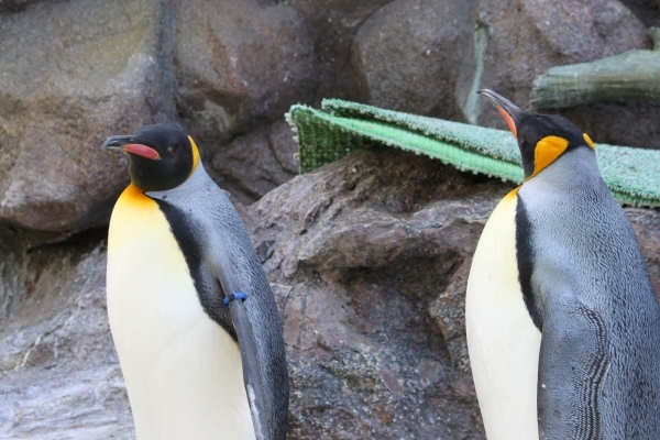 「なんだよ、こっちくんなよ。」 みたいな顔で横目で相手を見るキング、アオ君。白目が見えてますね。キングペンギンは身体が大きい分、目も大きいので、目つきがよくわかります。