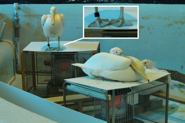 こちらはおたる水族館のペリカン、かつてエントランスホールのウミガメプールで越冬していた時の様子です。自主的に焼き鳥になる図みたいですが、この型のストーブは上側が余り熱くなりませんのでご安心を。で、立っている個体の足を拡大すると、指4本がすべて接地し水かきは3枚あることがわかります。