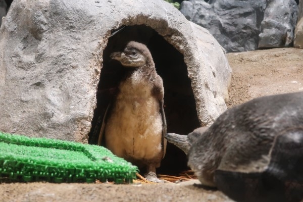 しばらくすると、ヒナがもう1羽巣穴から出て来ました(ヒナ2号と呼ぶことにしましょう)。巣の前には前回アクビをしていたヒナの頭とクチバシが見えています(ヒナ1号としましょう)。手前はお父さんの後ろ半分。