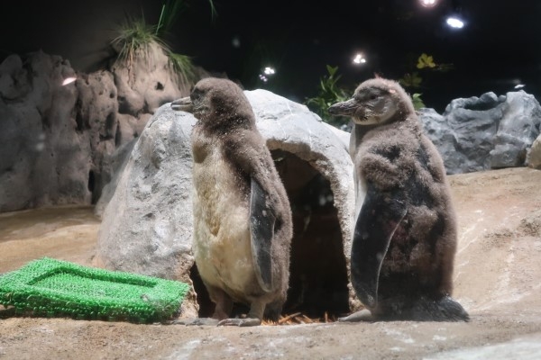 両親が少し離れて、巣の前にはフンボルトのヒナきょうだいが残されました。左が2号、右が1号です。(見つけた順。でも1号の方が先うまれに見えます。)