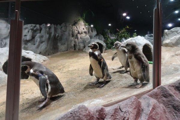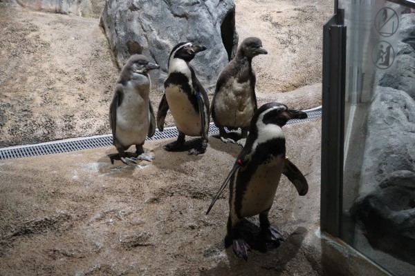 かりゆし水族館のフンボルト一家、坂の下の方へ移動を始めました。先頭はお母さん、ヒナきょうだいもついていきます。坂はわりときついので、ヒナたちは歩きにくそうです。