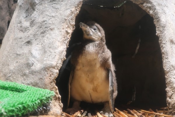 かりゆし水族館のフンボルト一家、お食事から戻りました。ヒナ2号はさっさと巣穴に引っ込んで、中でなんだか得意げなポーズ? お食事タイムにはほかのオトナたちも出てきたので、ヒナは隠れているのが上策。うっかりするとクチバシでどつかれたりすることも。