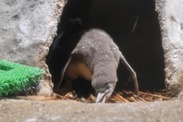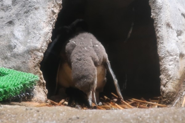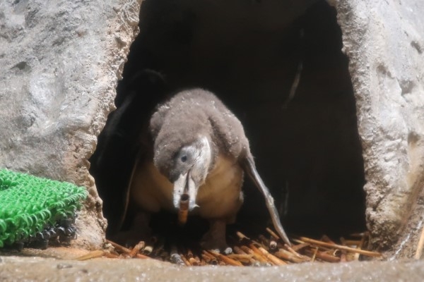 さて、お家に帰ったフンボルトのヒナ2号、巣材で遊び始めました。巣材は、古いヨシズをほぐして切ったようなものです。