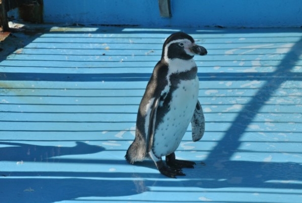 西日を受けて柵の影が縞模様になって長く伸びています。仲間の影も、長い。ペンギンに縞模様が映っていないのは、身体の日影側が見えているから。室蘭水族館のフンボルトでした。