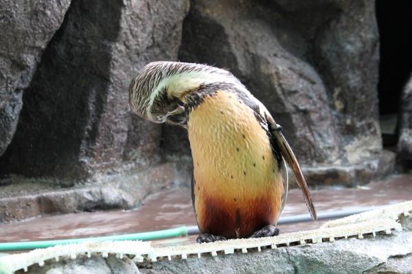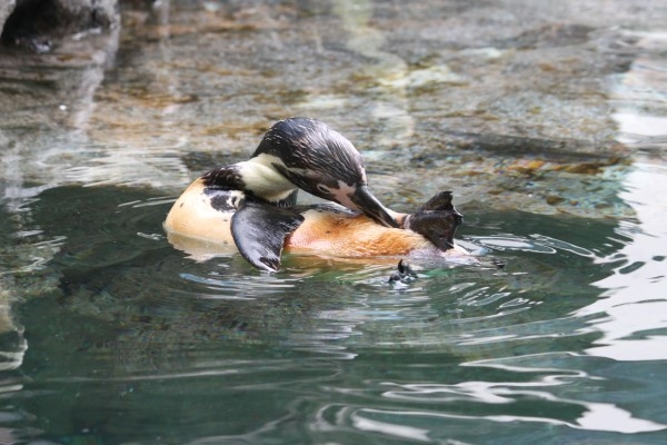 昔懐かし、マリンピア松島水族館のフンボルト。ハラが赤茶色になっていました。標準色は白に斑点。どうも、赤錆を含んだ水がたまっていて、そこで色がついてしまったみたいです。