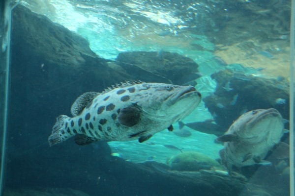 ペンギンのついでにカスリハタ、名古屋港水族館。いかついご面相にキュートな水玉模様のギャップが面白い、とっても大きなサカナです。