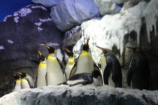 「来るで来るで」 海遊館のキング、片方の端に集まって、なにか警戒している感じ。寝ころんでいたアデリーも、同じ方が気になる様子。