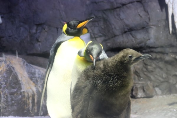 海遊館のキングひな、前回と同じく後輩ヒナです。もこもこでオトナとは見た目がずいぶん違いますが、だいたいオトナと同じことをします。首だってこんなにのびる!