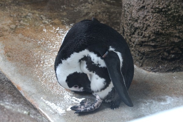 京都水族館のケープ、まるでペンギンロールになって羽づくろいしています。おや、お腹に大きくたるみが出ています。メタボ腹?じゃなくて、換羽終了直後で皮下脂肪が少なくなっているので、こういう姿勢をとると、たるむのです。