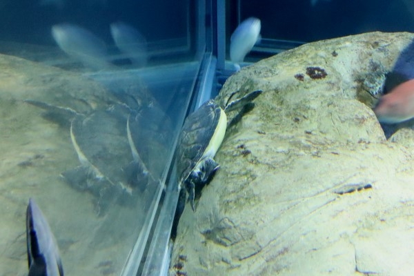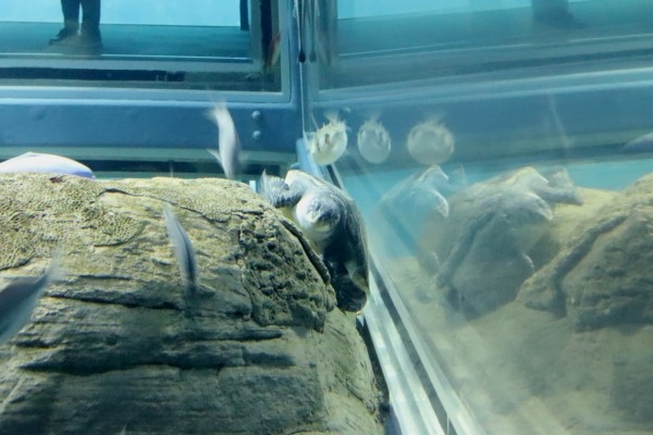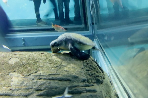 海遊館のアオウミガメ、足をもぞもぞさせるのですが、位置が変わりません。心配そうに人が立ち止まって見ていました。ガラスと岩の間に挟まってしまった!?みたいに見えます。
