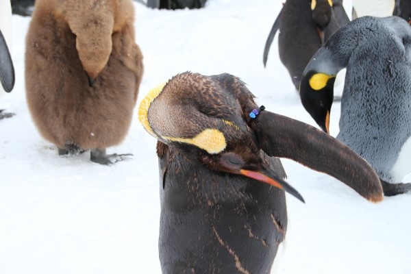 旭山動物園のキング、みんな首をにょーんと伸ばして羽づくろいタイム。よく伸びてよく曲がります。ヒナも負けてませんね。こんなふうに熱心に羽づくろいするのは、お昼寝に入る前のことが多いようです。