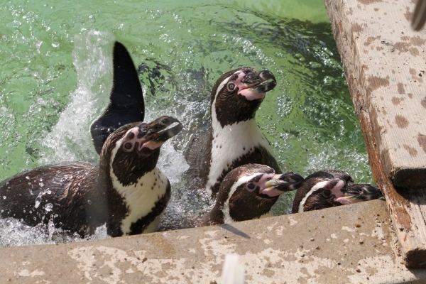 そんなにあわてなくても大丈夫なのに、サカナをもらおうと体全体が必死の表情を見せるフンボルト集団。静かに待つよりも楽しいのでしょうかね。京都市動物園の旧プールでした。